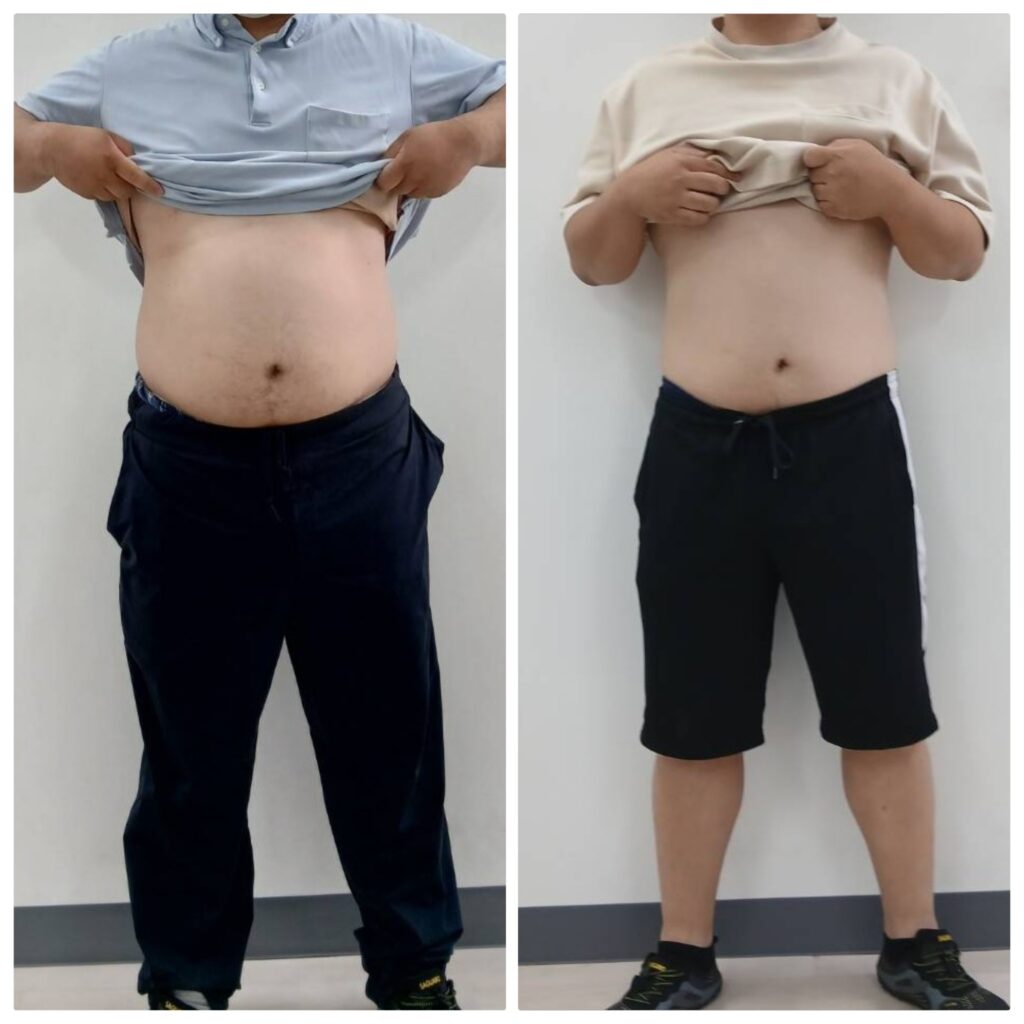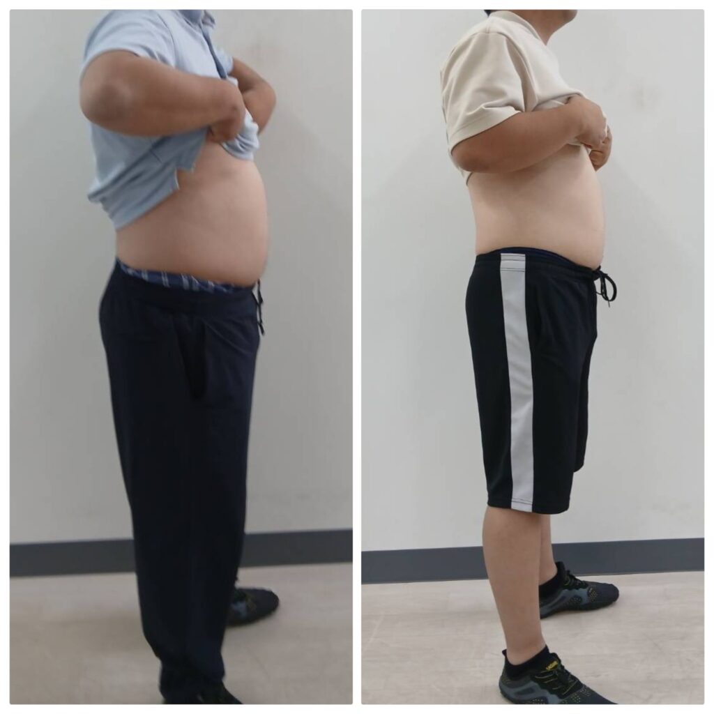 週1回のペースで4ヵ月で114㎏から99㎏にダイエット成功されたクライアント様のビフォーアフター写真です。